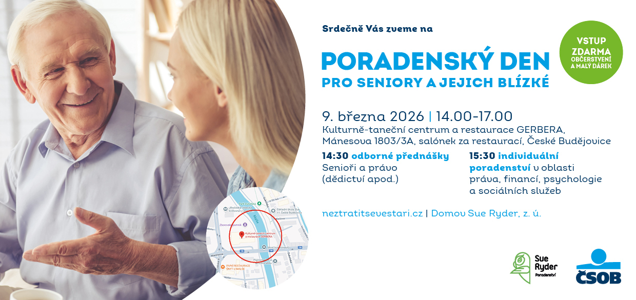 Zveme vás na bezplatné poradenství a inspirativní přednášku našich odborníků z poradenského portálu ve spolupráci s ČSOB. Získáte praktické informace, užitečné rady i prostor pro své dotazy k právním, finančním a sociálním otázkám spojeným se stářím.